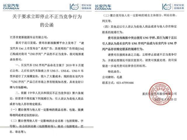 《公函》具体内容为,吉麦新能源旗下品牌凌宝汽车发布了“凌宝汽车Uni上市发布会”系列广告,广告语中使用了Uni产品名称,与长安UNI系列容易产生混淆和误导,要求吉麦新能源立刻停止该混淆行为,并以书面形式回复处理情况。