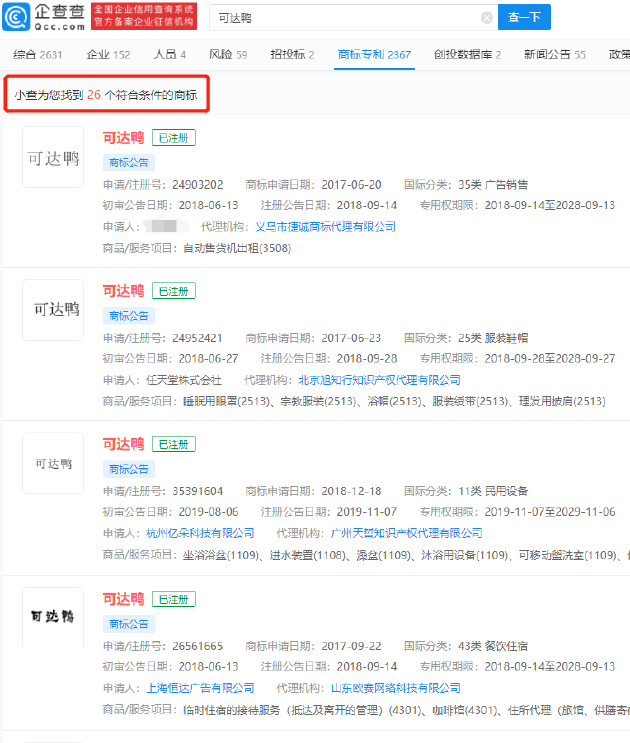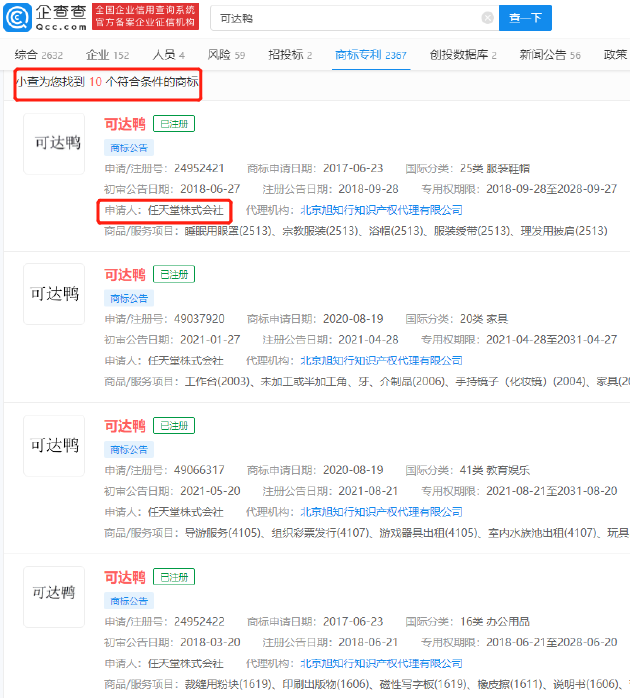 三言财经 5月23日消息,近日,“魔性”的可达鸭音乐盒走红网络。企查查App显示,“可达鸭”商标已被多家公司及个人注册,目前已成功注册商标26个,其中10个商标由任天堂株式会社注册,国际分类包括服装鞋帽、家具、教育娱乐等。