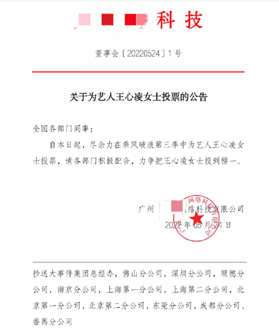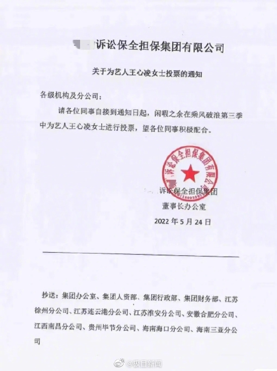 三言财经 5月25日消息,近日,网传一份通知《关于为艺人王心凌女士投票的通知》,通知内容显示号召公司各级机构和分公司员工为综艺节目《乘风破浪》第三季中的王心凌投票。