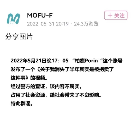 5月31日,该UP主所属社团官方账号MOFU-F发布动态辟谣:经警方查证,之前《关于我消失了半年其实是被拐卖了这件事》视频内容不属实。占用了社会资源,给社会带来了不良影响。