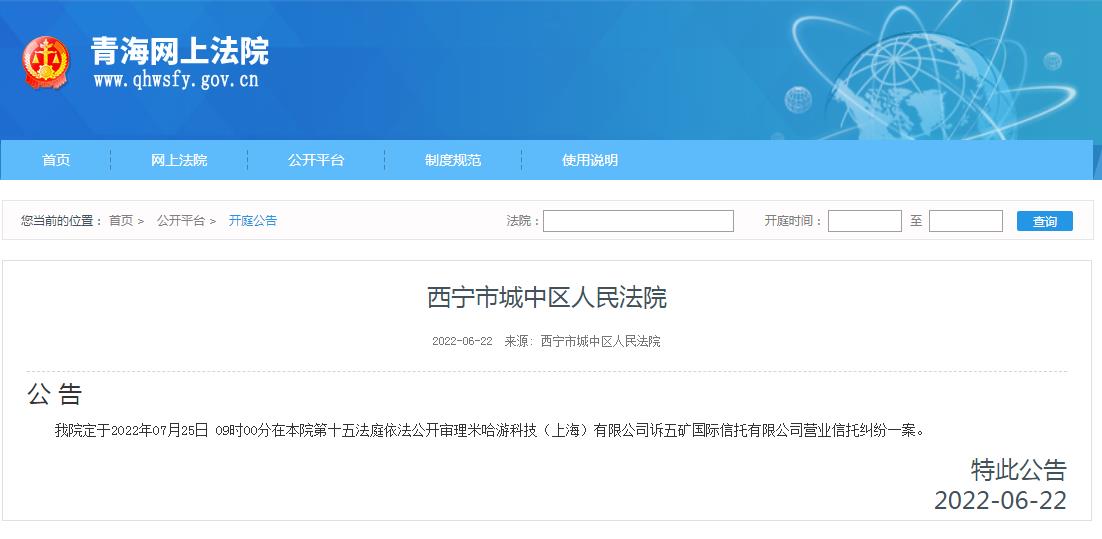三言财经 6月27日消息,据青海省西宁市城中区人民法院消息,该院定于2022年07月25日09时00分在本院第十五法庭依法公开审理米哈游科技 (上海) 有限公司诉五矿国际信托有限公司「营业信托纠纷」一案。除了米哈游,另一游戏厂商上海莉莉丝网络科技有限公司与五矿信托的营业信托纠纷一案也将在同一天依法公开审理。