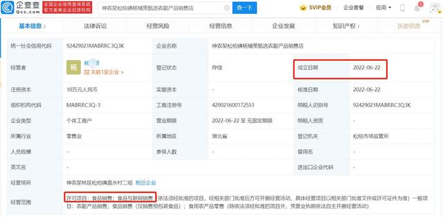企查查APP显示,余秀华男友杨某策于2022年6月注册神农架松柏镇杨槠策甄选农副产品销售店,经营范围包含食品销售、食品互联网销售等。