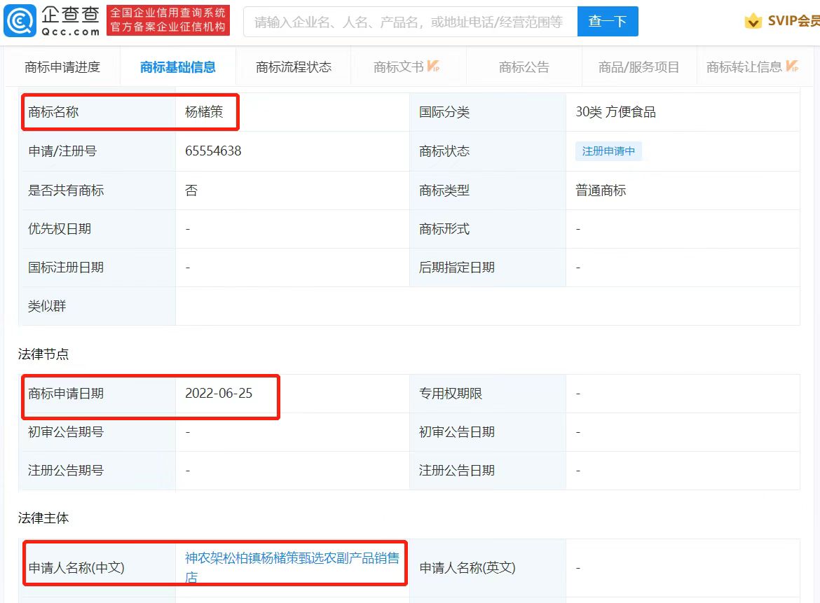 企查查信息显示,成立公司后,杨槠策甄选店随即申请注册“杨槠策”商标,国际分类30类方便食品, 商标状态为注册申请中。此外,抖音平台认证为“杨槠策”的用户推荐宝贝已售2505件。