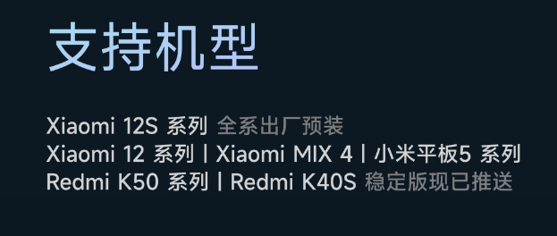 目前,小米妙享中心支持的机型有小米12S系列、小米12系列、小米MIX 4、小米平板5系列,以及Redmi K50系列、Redmi K40S。
