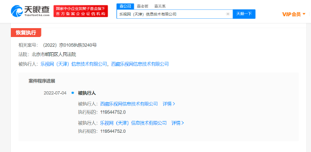 三言财经 7月15日消息,天眼查App显示,近日,乐视网(天津)信息技术有限公司、西藏乐视网信息技术有限公司新增一则恢复执行信息,执行标的近1.2亿元,执行法院为北京市朝阳区人民法院。