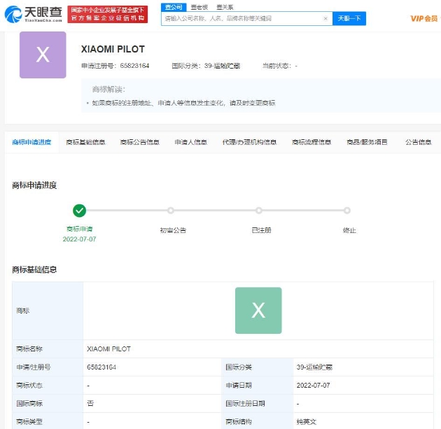 三言财经 7月15日消息,天眼查App显示,近日,小米科技有限责任公司申请注册多个“小米自动驾驶”“XIAOMI PILOT”商标,国际分类涉及运输工具、科学仪器、机械设备、广告销售等,当前商标进度均为申请中。值得一提的是,同批次申请的还有一款图形商标,国际分类涉及金融物管、科学仪器、网站服务,尚不清楚该图形是否与小米自动驾驶有关。