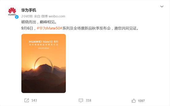 三言财经 8月22日消息,华为今日宣布,将于9月6日正式举行华为Mate50系列及全场景新品秋季发布会。