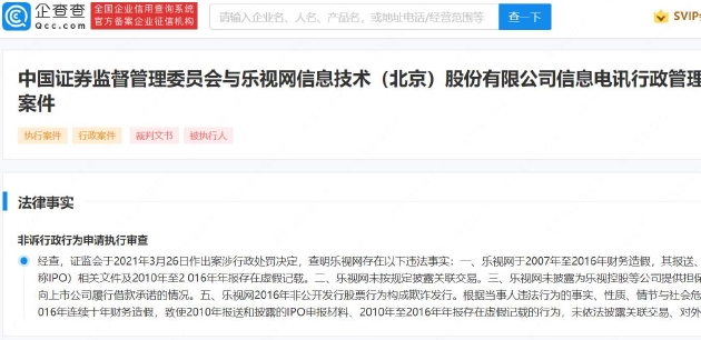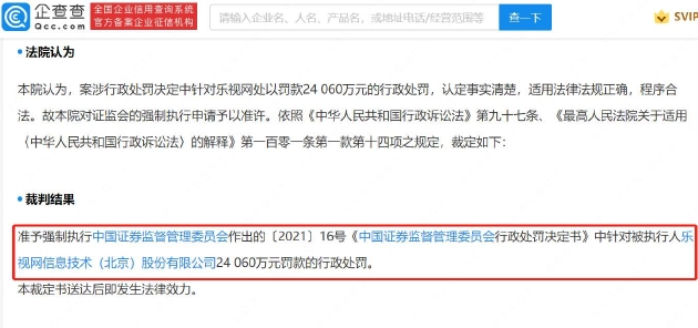 三言财经 8月26日消息,企查查APP显示,近日,北京金融法院裁定准予强制执行证监会针对被执行人乐视网2.4亿元罚款的行政处罚。裁定书显示,2021年3月证监会查明乐视网从2007年至2016年财务造假,其报送、披露的申请首次公开发行股票并上市相关文件及2010年至2016年年报存在虚假记载。同时,乐视网未按规定披露关联交易,且未如实披露贾跃芳、贾跃亭向上市公司履行借款承诺的情况。此外,乐视网2016年非公开发行股票行为构成欺诈发行。根据《中华人民共和国证券法》第一百八十九条、一百九十三条的规定,对乐视网合计罚款2.4亿元。