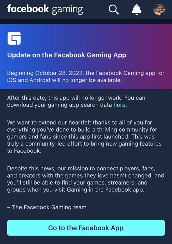 三言财经 8月31日消息,Meta旗下游戏直播应用程序Facebook Gaming发布通知称,自2022年10月28日开始,该应用程序将不再支持iOS和Android平台。
