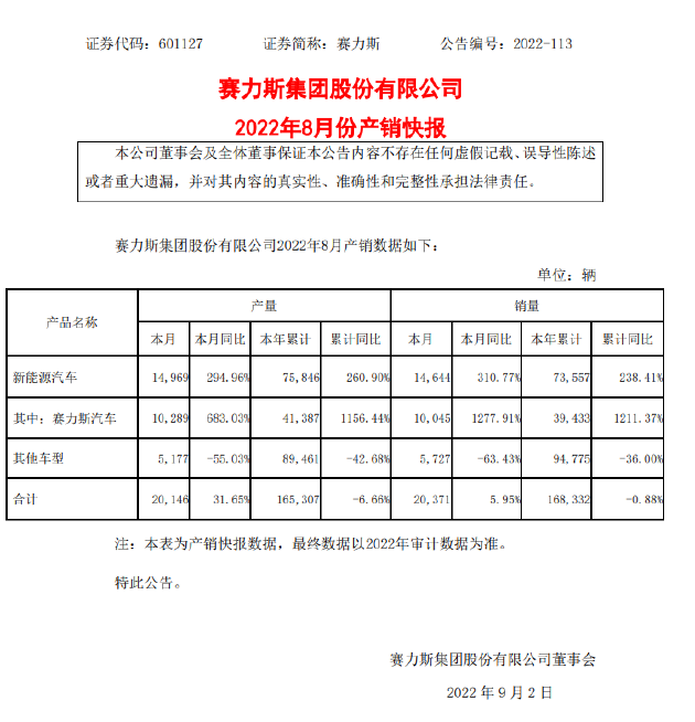 三言财经 9月1日消息,赛力斯发布8月份产销快报,新能源汽车8月销量14644辆,同比增长310.77%;其中,赛力斯汽车8月销量10045辆,同比增长1277.91%。