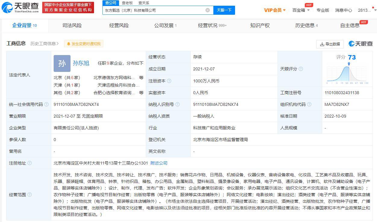 东方甄选(北京)科技有限公司成立于2021年12月,法定代表人为孙东旭,经营范围含销售日用品、化妆品、服装鞋帽、电子产品等;组织文化艺术交流活动;网络文化经营;演出经纪等。