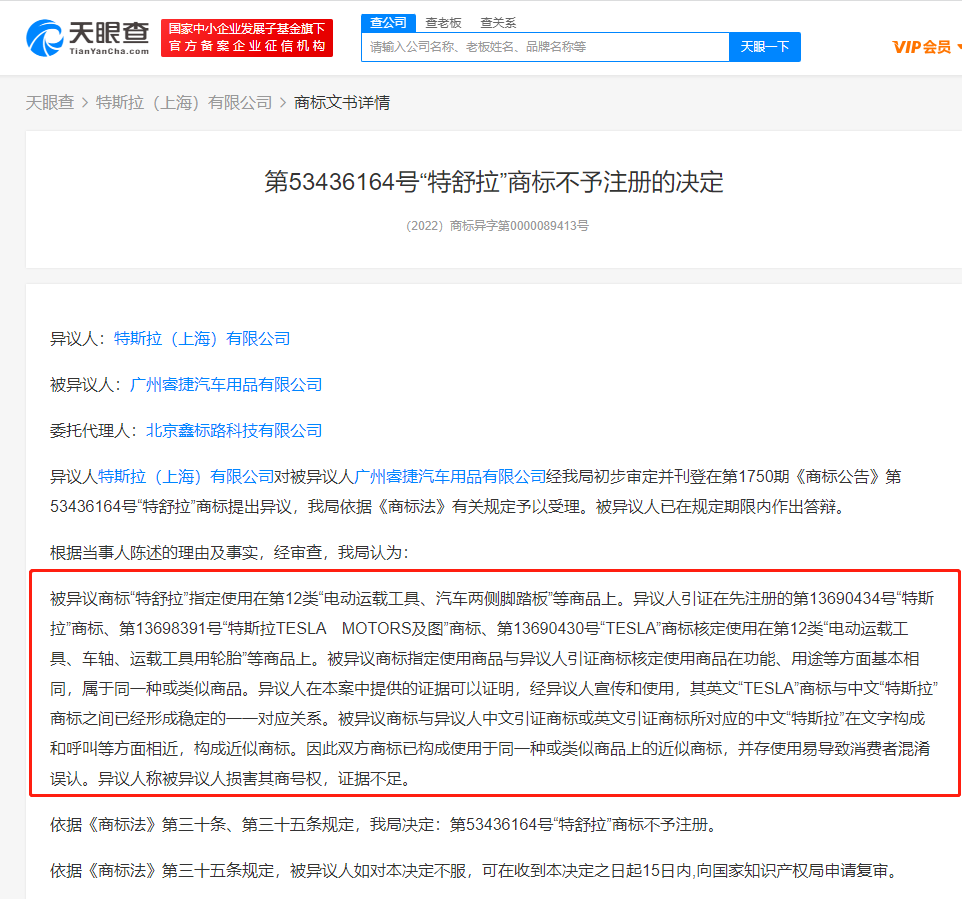 文书显示,特斯拉(上海)有限公司对广州睿捷汽车用品有限公司申请的“特舒拉”商标提出异议,国家知识产权局审查认为,被异议商标与异议人引证在先注册的“特斯拉”等商标使用商品在功能、用途等方面基本相同,属于同一种或类似商品。被异议商标与异议人中文引证商标或英文引证商标所对应的中文“特斯拉”在文字构成和呼叫等方面相近,构成近似商标。因此双方商标已构成使用于同一种或类似商品上的近似商标,并存使用易导致消费者混淆误认。异议人称被异议人损害其商号权,证据不足。最终,国家知识产权局决定被异议商标不予注册。