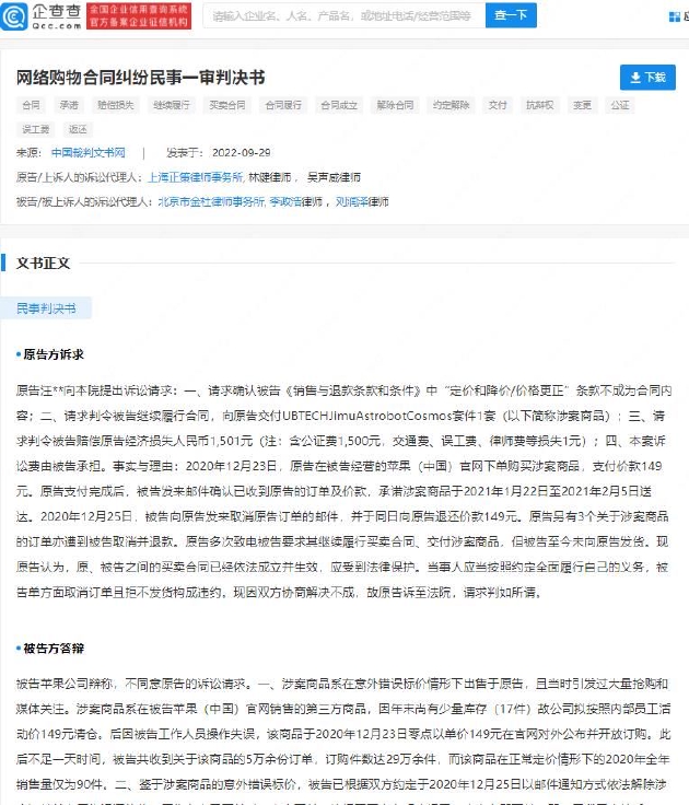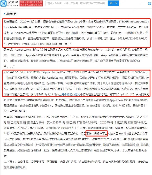 法院查明,2020年12月,原告在苹果Apple(中国)官网购买了4件商品,单价149元,两天后被告知商品因工作人员操作不当,价格存在问题,订单被取消。