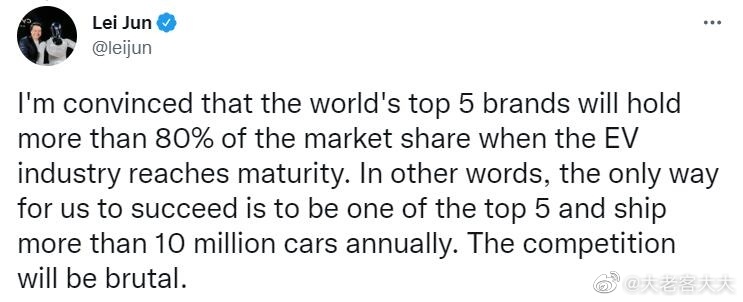 雷军相信,当电动车行业进入成熟期时,世界前五大品牌将占据80%以上的市场份额,“换句话说,我们成功的唯一途径是成为前五名之一,并且每年出货量超过1000万辆。竞争将是残酷的。”