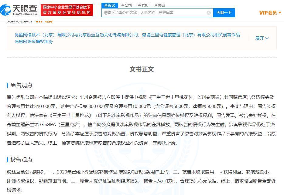原告优酷公司诉称,被告未经授权,在奇境主题养生馆GinSPA(三里屯店),擅自提供电视剧《三生三世十里桃花》的在线播放,其行为分流了本应属于原告的观影流量,严重侵害原告合法权益,请求法院判令两被告赔偿经济损失30万元等。被告粉丝互动公司辩称,涉案作品系用户上传,未收取费用,影响范围小。