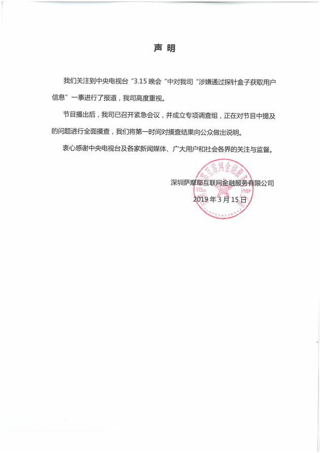 三言财经 3月15日消息,2019年中央广播电视总台3·15晚会今日举行,其中曝光了萨摩耶金服借探针盒子搜集消费者个人信息。