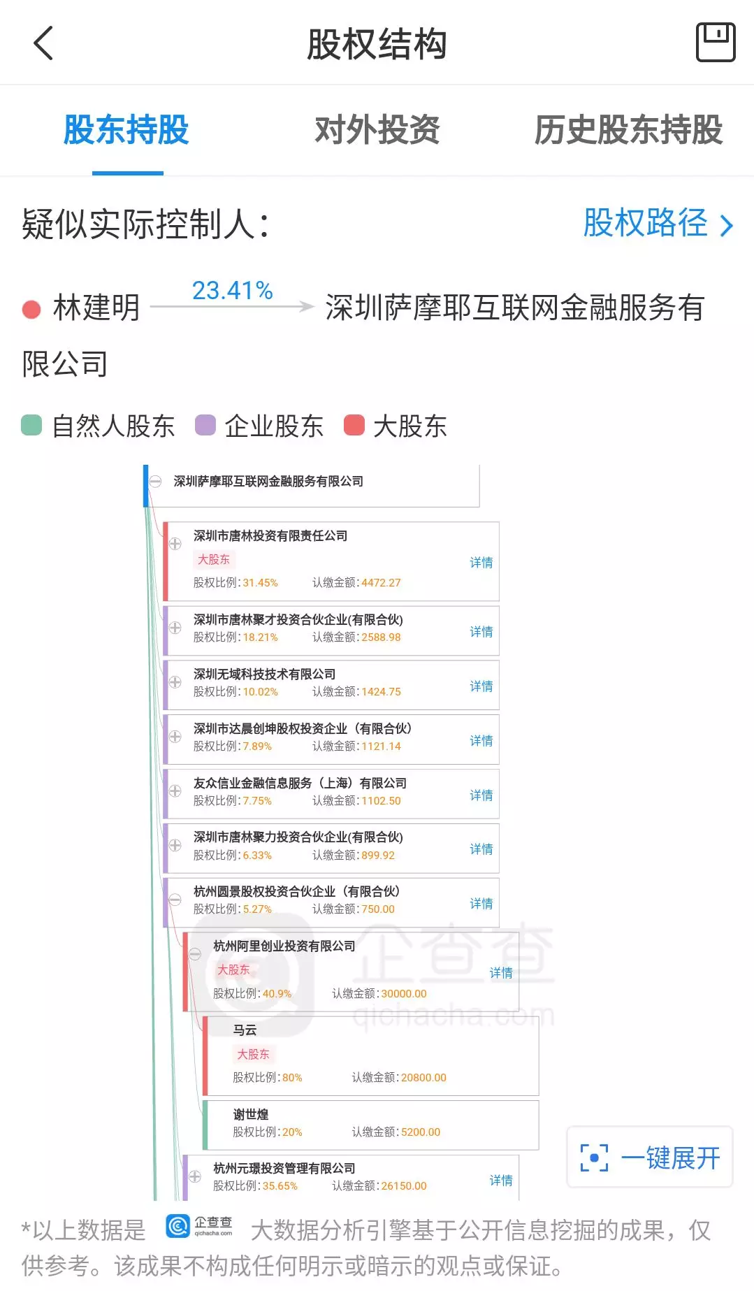 三言财经 3月16日消息,据企查查显示,昨日,在央视今年315晚会曝光的企业中,深圳萨摩耶互联网金融服务有限公司股东中包括马云持股32.72%的杭州圆景股权投资合伙企业。