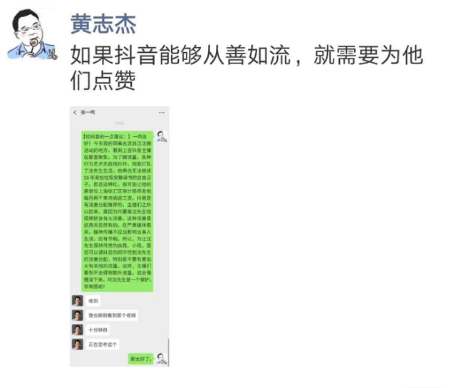 据华云网消息,媒体人、自媒体《呦呦鹿鸣》创始人黄志杰致信字节跳动创始人张一鸣,表示“看到上百抖音主播在那里聚集,为了蹭流量,各种行为艺术无底线炒作,彻底打搅了沈先生的生活....从严肃媒体看来,媒体传播不应当影响当事人的生活,应有节制...是否可以请抖音的同学控制沈先生的流量分配,特别是不要有意加大有关他的流量。对沈先生也是一个保护。”建议抖音对这类不良网红主播进行限流。