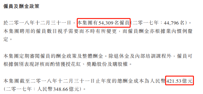 财报显示,在公司员工薪酬方面,腾讯目前有员工54309名(2017年为44796名),总薪酬成本为421.53亿元人民币(2017年为348.66亿元),折合人均年薪77.6万元,月薪6.46万元。