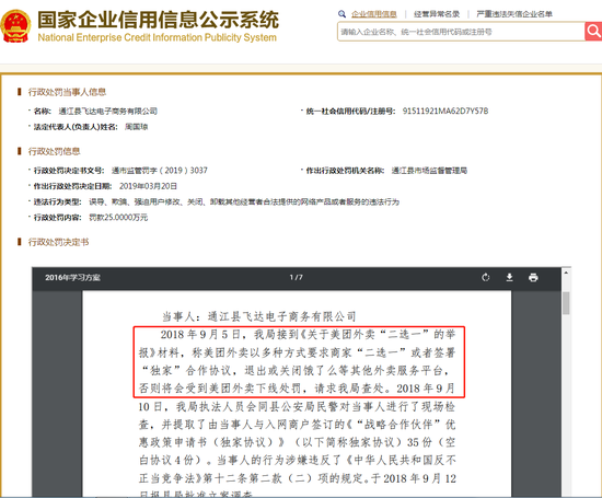 三言财经3月27日消息,国家企业信用信息公示系统显示,2019年3月20日,因涉嫌误导、欺骗,强迫用户修改、关闭、卸载其他经营者合法提供的网络产品或服务,四川省巴中市通江县市场监督管理局对美团外卖强迫商家“二选一”当事人进行处罚,罚金高达25万元罚款,并且“责令停止违法行为”。
