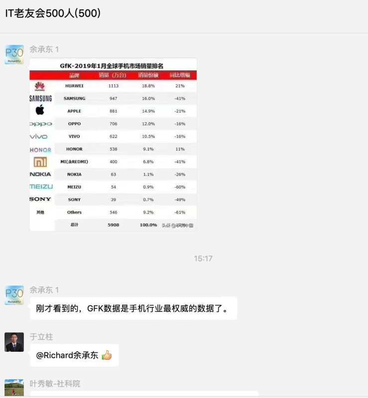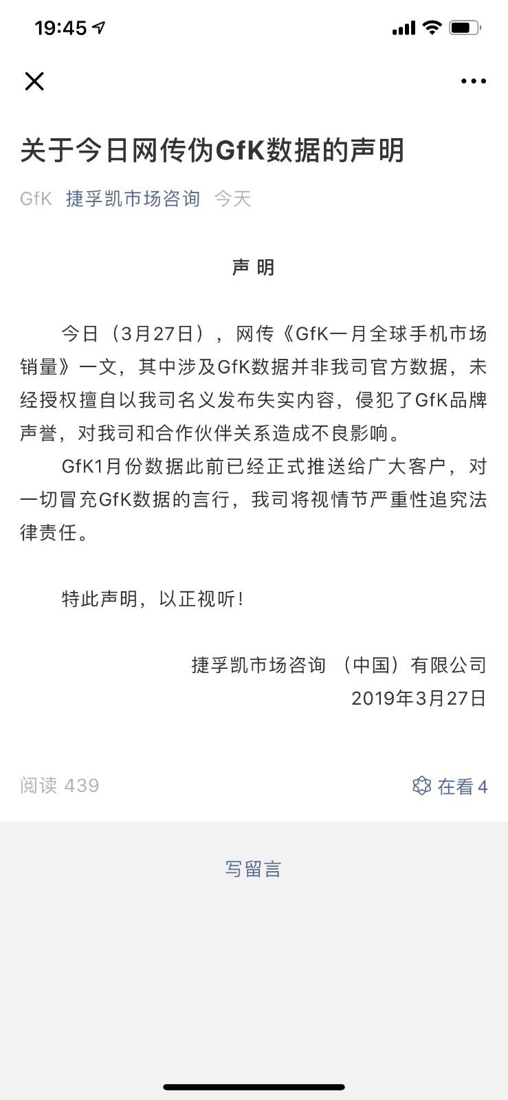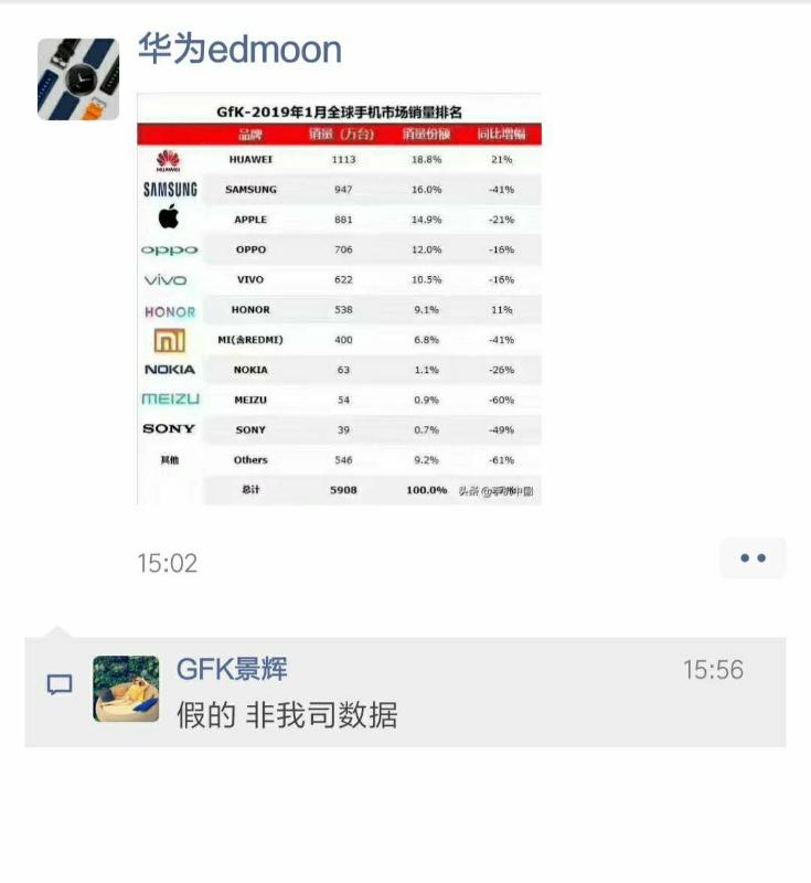 这事儿就非常有意思了,数位华为高管公开场合和朋友圈对外发布该数据,最后却被GfK直接打脸称数据并非该机构数据,随后,GfK官方微信对外发布声明,再次官方否认了该数据。