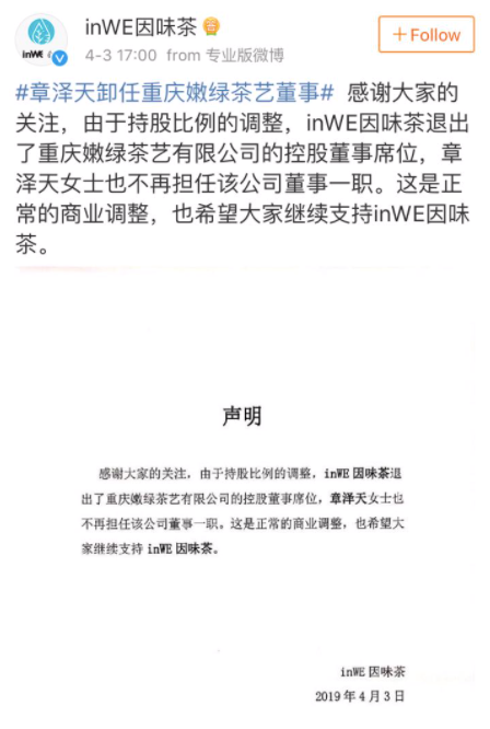 三言财经 4月3日消息,针对章泽天卸任重庆嫩绿茶艺有限公司董事事件,inWE因味茶发布官方声明称:由于持股比例的调整,inWE因味茶退出了重庆嫩绿茶艺有限公司的控股董事席位,章泽天也不再担任该公司董事一职,这是正常的商业调整。
