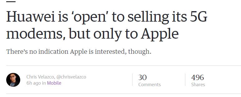 Engadget报道称,一位了解情况的消息人士向Engadget证实,华为现在“开放”销售其5G Balong 5000芯片组,但仅限于一家公司:Apple。