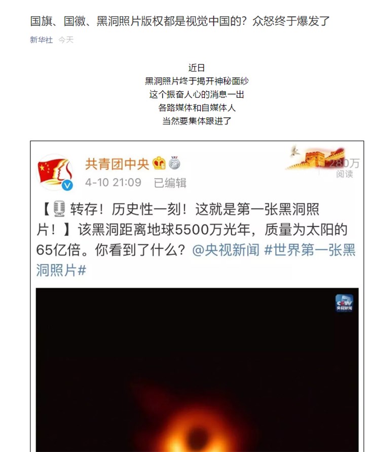 三言财经 4月11日消息,今日晚间新华社官方微信号发文《国旗、国徽、黑洞照片版权都是视觉中国的?众怒终于爆发了》,并在文章中指出,“我们尊重版权保护,但如果打着版权保护的幌子做起了生意,怕是不太合理。”