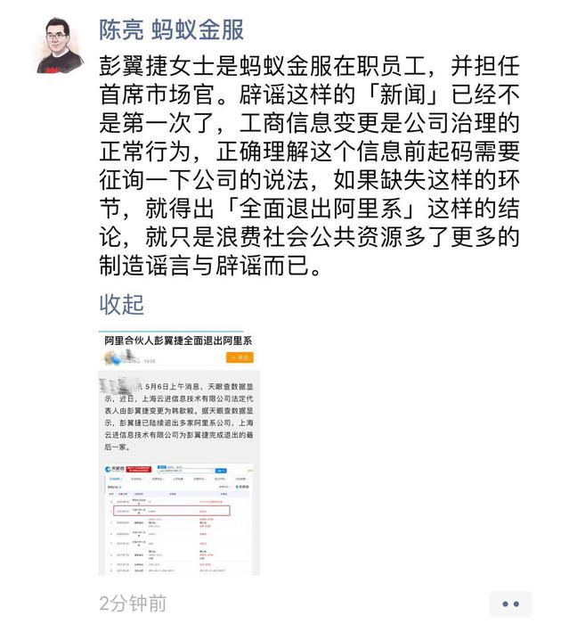 针对阿里合伙人彭翼捷全面退出阿里系的传闻,蚂蚁金服副总裁陈亮在朋友圈回应称,彭翼捷是蚂蚁金服的在职员工,并担任首席市场官,工商信息变更是公司治理的正常行为。