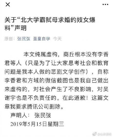 三言财经5月16日消息,5月13日,一篇以“北大学霸弑母求婚的妓女爆料”为内容的文章在网络上热传。此篇文章首次发布在一个名为“圣童自学”的微信公众号上,文章的作者为张民弢。随后张民弢发文辟谣,称文章内容纯属虚构。不少网友质疑其发文动机,已经涉嫌造谣。
