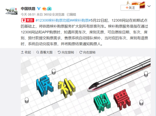 三言财经 5月22日消息,12306网站22日起将铁路候补购票服务扩大到所有旅客列车。当旅客查询到没有余票时,可根据需求选择相应车次、席别对应的“候补”区域进行候补购票。候补购票功能不收取额外费用,每名用户可提交1个候补订单、选择2个相邻的乘车日期、预订3张车票。