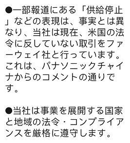 此外,松下日本总社也发布最新声明称,“关于一些日本媒体‘停止交易’的用词与事实不符。在不违反美国法令的基础下,我公司正在与华为保持交易。这和松下(中国)的声明一致。我公司严格遵守开展业务国家或地区的法律法规。”