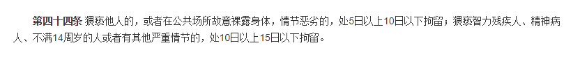 据悉,《中华人民共和国治安管理处罚法》第四十四条规定的内容为:猥亵他人的,或者在公共场所故意裸露身体,情节恶劣的,处五日以上十日以下拘留;猥亵智力残疾人、精神病人、不满十四周岁的人或者有其他严重情节的,处十日以上十五日以下拘留。