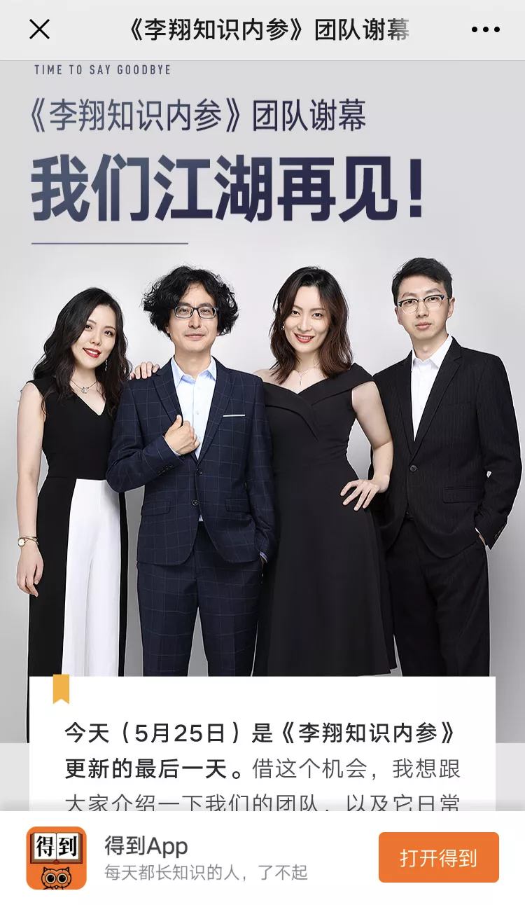 5月25日,得到《李翔知识内参》团队发布谢幕通知,称今日是专栏更新的最后一天,并表示:江湖再见。