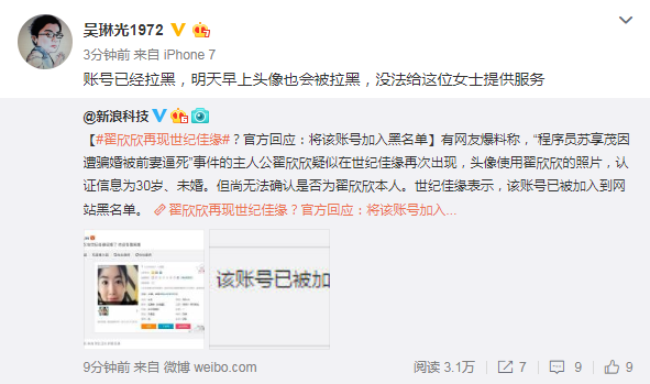 对此,百合佳缘CEO吴琳光在微博回应称,账号已经拉黑,明天早上头像也会被拉黑,没法给这位女士提供服务。世纪佳缘客服也表示,该账号已被加入到网站黑名单。