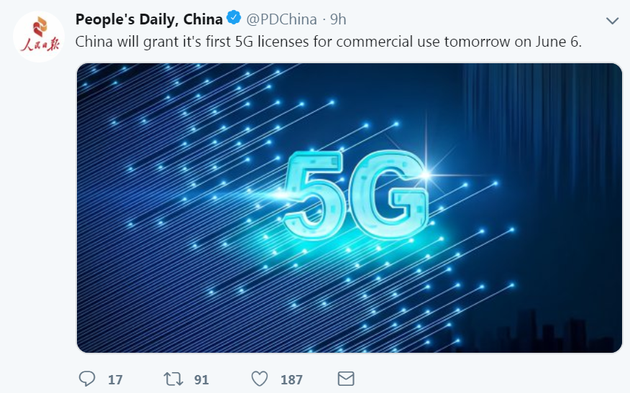 三言财经6月6日消息,人民日报6月5日晚在其官方推特上宣布,中国将于6月6日发放5G商用牌照。