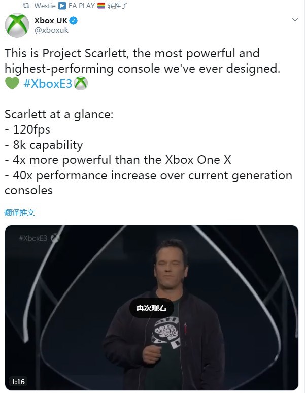 根据微软介绍,下一代主机将采用基于AMD Zen 2和Radeon RDNA架构的定制设计CPU,新主机将比Xbox One X性能强四倍。微软也将使用快速的GDDR6内存,微软称它将“迎来我们从未见过的分辨率和帧率。”