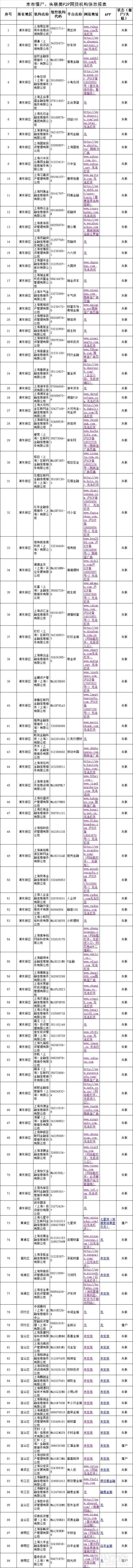 三言财经 6月14日消息,今日上海市地方金融监管局在其官方网站上发布第一批失联类P2P网贷机构共99家,债权尚未了结的出借人可自本公告发布之日起15日内向网贷机构所在区金融工作部门报告。名单内网贷机构应积极主动处置存量网贷债权,主动与相关区金融工作部门进行联系。