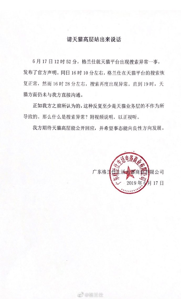 同时,格兰仕还发布公开信称,在天猫平台的搜索在16时28分左右再度出现异常,且天猫方面未直接沟通。格兰仕要求天猫高层能公开回应。