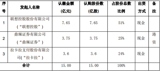 投资标的的股权结构方面,公告显示,联想控股认缴出资7.65亿元,占比51%;鼎珮证券认缴出资3.75亿元,占比25%。