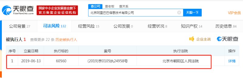 三言财经6月18日消息,天眼查数据显示,6月13日,北京阿里巴巴信息技术有限公司新增被执行人信息 ,执行标的60560,案号为(2019)京0105执24958号,执行法院为北京市朝阳区人民法院。