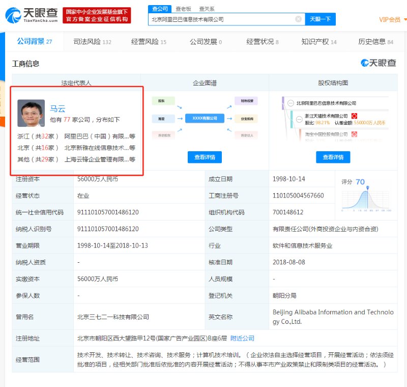 北京阿里巴巴信息技术有限公司成立于1998年10月,注册资本5亿6000万人民币,马云任法定代表人兼执行董事,谢世煌任监事。