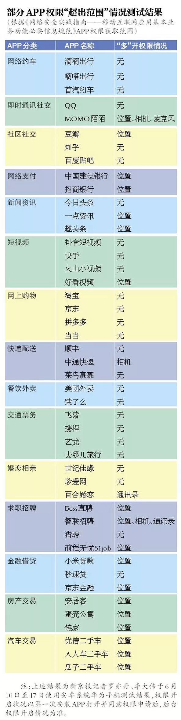 6月初,全国信息安全标准化技术委员曾会发布《网络安全实践指南——移动互联网应用基本业务功能必要信息规范》(以下简称《信息规范》),依据个人信息收集最少够用的原则以及不同种类APP的业务范围,对地图导航、网上购物、餐饮外卖等16类APP收集个人信息的范围给出了参考。
