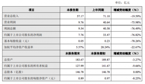 数据显示,2019年上半年,公司实现营业收入57.17亿元,同比下降19.59%;实现营业利润9.76亿元,同比下降75.98%;实现归属上市公司股东净利润7.76 亿元,同比下降76.82%;基本每股收益0.05元,同比下降78.26%。