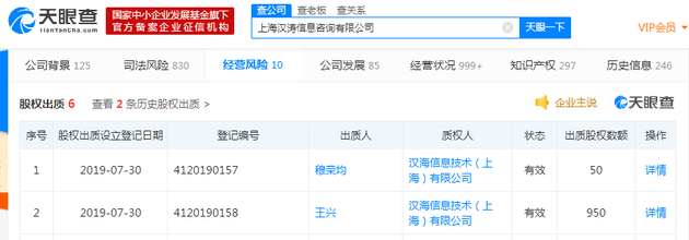 三言财经8月2日消息,天眼查数据显示,7月30日,大众点评主体公司上海汉涛信息咨询有限公司发生股权出质,王兴、穆荣均为出质人,质权人为汉海信息技术(上海)有限公司 ,王兴、穆荣均出质数额分别为950、50。