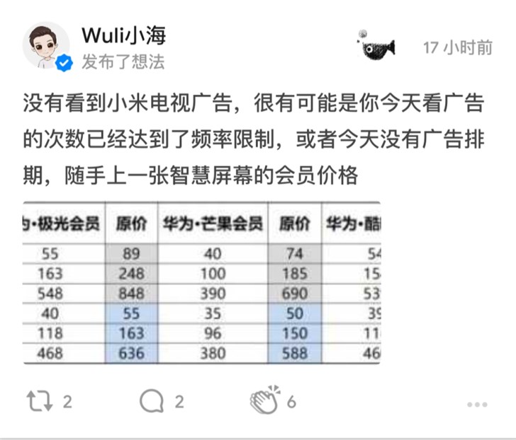 周末晚间,知乎认证为小米产品运营经理的@Wuli小海 发文称,没有看到小米电视广告,很有可能是你今天看广告的次数已达到了频率限制,或者今天没有广告排期。