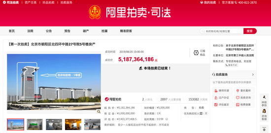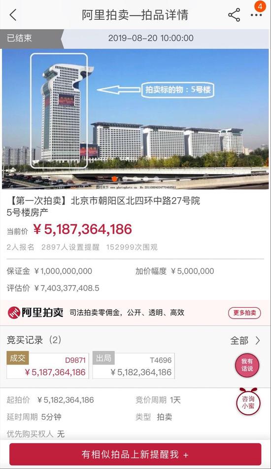 三言财经 8月20日消息,今天上午,临近截拍时间前,北京金隅集团旗下的北京钰珵置业有限公司,在阿里拍卖平台上以51.87亿成功拍得这处房产,成为盘古大观龙首的新主人。此前一天,盘古大观5号楼被北京市第三中级人民法院在阿里拍卖平台上依法进行司法拍卖,为期1天。