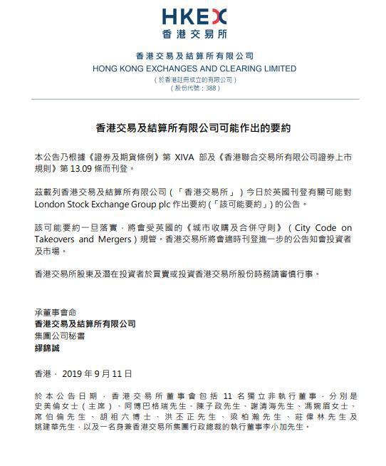 三言财经9月11日消息,香港交易及结算所有限公司(香港交易所)今日宣布,其已向LondonStockExchangeGroupplc(伦敦证券交易所集团)的董事会提议,将香港交易所及伦敦证券交易所集团两间公司合并。香港交易所董事会相信,与伦敦证券交易所集团的建议合并是一项互利共赢的重大战略机遇,可以打造一个领先的全球性金融基础设施。