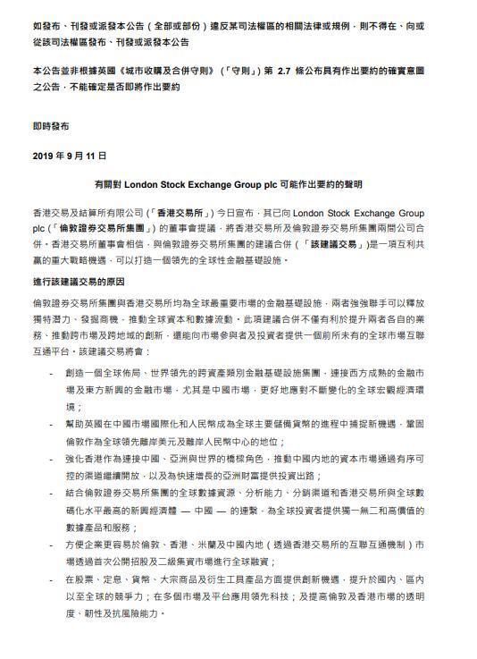 港交所表示,伦交所与港交所均为全球最重要市场的金融基础设施,两者强强联手可以释放独特潜力、发掘商机,推动全球资本和数据流动。此项建议合并不仅有利于提升两者各自的业务、推动跨市场及跨地域的创新,还能向市场参与者及投资者提供一个前所未有的全球市场互联互通平台。