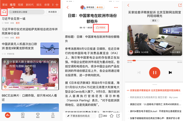 新浪新闻App通过AI语音播报功能——“听新闻”向用户播放国内、国际、社会、体育、娱乐、军事、科技、财经等领域的热点讯息。音频可自动连续播放,让用户在开车、健身、做家务等场景下,也能充分利用碎片时间获取新闻资讯。